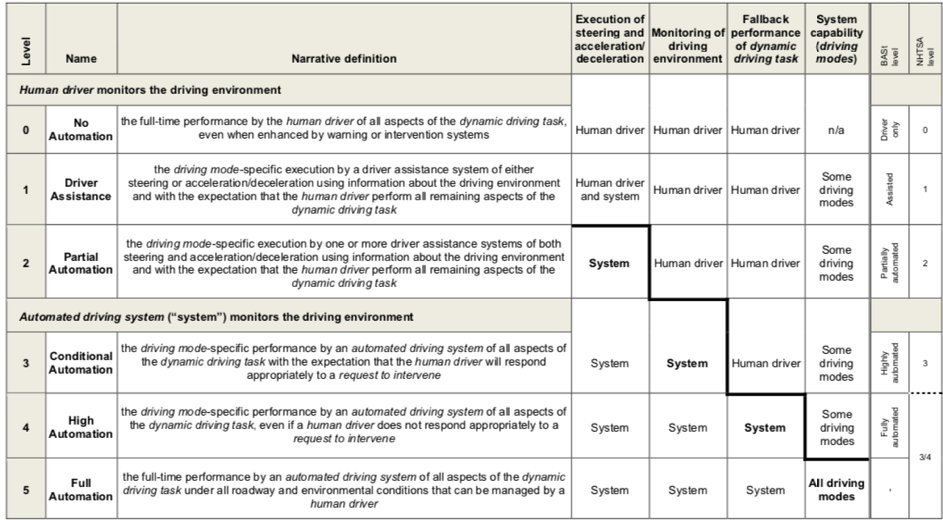 De mogelijkheden van auto’s om zichzelf te besturen verschillen in grote mate. Om deze reden heeft de Society of Automotive Engineers (SAE) een classificatie op zes niveaus ontwikkeld (figuur hieronder)