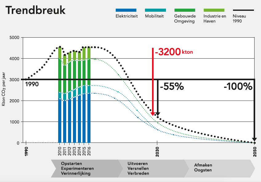 De brochure laat zien voor welke immense opgave de stad de komende 30 jaar staat: Op dit moment bedraagt de CO2-uitstoot op het Amsterdamse grondgebied van Amsterdam ongeveer 4.500 kiloton tegen 3.010 kiloton in 1990. Het doel voor 2030 is een reductie van 3.200 kiloton. Dat er sprake is van een trendbreuk is dus een understatement.