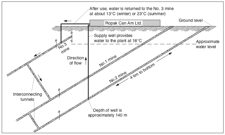 De Ropak-verpakkingsfabriek in Springhill, Nova Scotia, zet sinds 1998 met succes mijnwater in voor haar warmwatervoorziening[5]. Mijnwater wordt bij een temperatuur van 18°C met een snelheid van 4 liter per seconde uit een ondergelopen kolenmijn gepompt. Hierbij passeert het een warmtepompsysteem voordat het via een andere schacht wordt geïnjecteerd (zie afbeelding hieronder). Het betreft dus een volledig gesloten lus. In vergelijking met conventionele verwarmingssystemen bespaart het bedrijf jaarlijks CAD 45.000 of het equivalent van ongeveer 600.000 kWh.