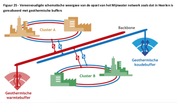 • De retourleiding (oranje buis in bovenstaande figuur) is niet langer nodig en wordt ingezet voor de toevoer en afvoer van warm of koud mijnwater om de capaciteit van het backbone te vergroten.