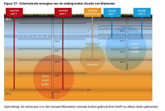 • Water dat wordt terug geleverd aan het mijnwaterreservoir is op temperatuur gebracht van het koude dan wel het warme deel daarvan. Daarom zijn alle putten geschikt gemaakt voor zowel het onttrekken als het teruggeleiden van water.