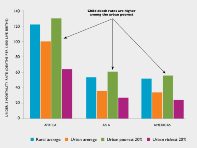 Kindersterfte is het laagst in de meest welvarende gezinnen in ontwikkelde landen. Gezondheid en rijkdom zijn nauw met elkaar verbonden. De onderstaande figuur illustreert de verschillen in kindersterfte in stedelijke en landelijke regio’s in verschillende delen van de wereld[2].