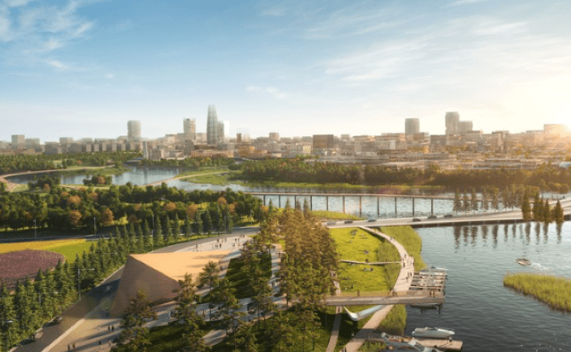 Impressie van een deel van Xiong’an, een nieuw te verstedelijken gebied ten zuiden van Beijing, naar ontwerp van architectenbureau SOM. Een belangrijk deel van het gebied bestaat uit ‘wetlands’ die in het ontwerp zijn geïntegreerd. Afbeelding SOM