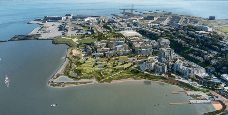 Het ontwerp van architectenbureau SOM voor India Basin, een voormalig industriegebied nabij San Francisco, dat een actief waterfront moet worden en daarmee ook een rol speelt in de kustbescherming. Afbeelding SOM