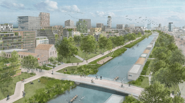 Impressie van Merwede wijk, een autovrije en groene stadsuitbreiding van Utrecht, nabij het centrum, getekend door Marco Broekman en OKRA. Gemeente Utrecht.