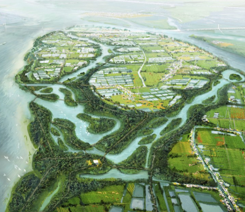 Impressie van Seagull Island Master Plan, gelegen in de delta van China’s Parel Rivier, ontworpen door SOM.  De donkergroene en blauwe zones maken deel uit van de kustbescherming. De groene gebieden hebben een agrarische bestemming.