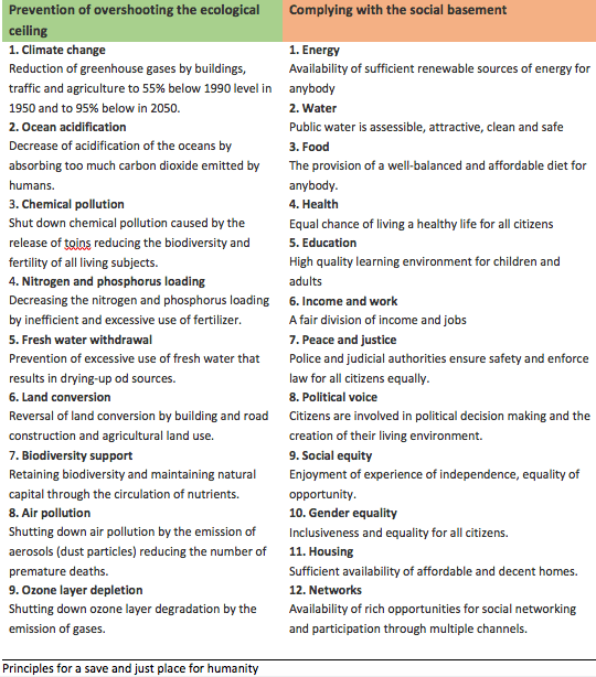 Alle samenlevingen moeten beleid ontwikkelen tussen de twee lijnen in. Dit geldt voor de wereld als geheel, maar ook voor landen, regio’s en steden. Of zoals Kate Raworth het zelf uitdrukt: Human activities in each entity must not overshoot its ecological ceiling, thus harming the self-sustainable capacity of that entity. At the same time, these activities must not shortfall the social foundation of that entity, harming its long-term well-being. Between both circles, a safe and just space for humanity – now and in the future – is created[9].