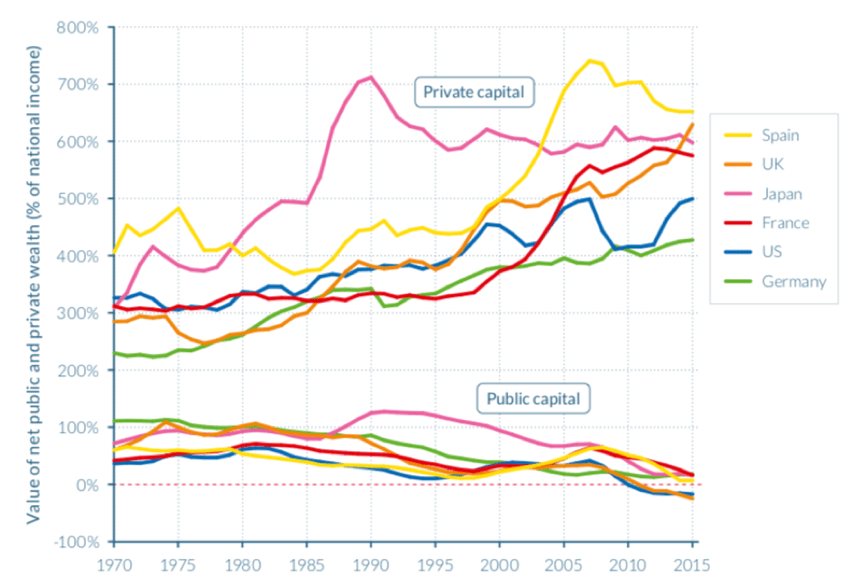 De onderstaande grafiek laat zien dat sinds 1970 in bijna alle landen een enorme verschuiving heeft plaatsgevonden van publiek naar privaat vermogen[15]. Privaat vermogen – geconcentreerd bij bedrijven en rijke personen – is aanzienlijk meer toegenomen dan publiek vermogen. Publiek vermogen (overheidsuitgaven minus staatsschuld) is in de meeste welvarende landen negatief of bijna nul.