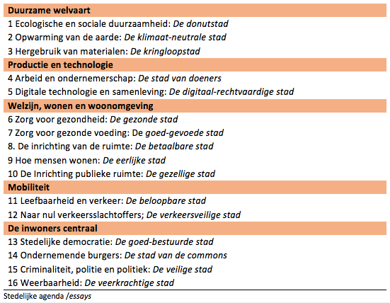 De stedelijke agenda voor steden van de toekomst bestaat uit 75 aanwijzingen voor stedelijke acties. Ik gebruik de term stedelijke acties in plaats van beleid omdat niet alleen van het gemeentebestuur, maar van alle andere ‘stakeholders’ bijdragen wordt gevraagd.