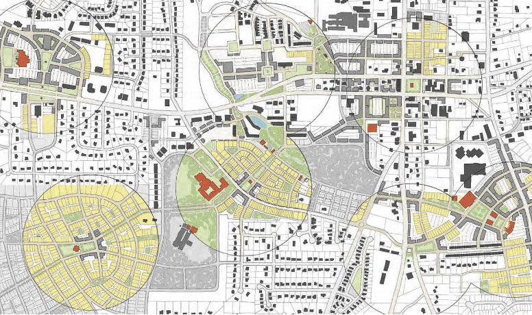 Voor de ruimte tussen de cirkels kan gedacht worden aan meer grootschalig groen, wijk-overstijgende voorzieningen, een ondergrondse parkeergarage, routes voor het openbaar vervoer en doorgaande wegen. Vaak zullen de buurten trouwens naadloos in elkaar overgaan.