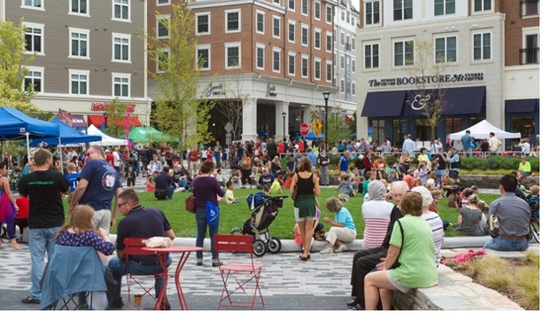 Volgens new urbanism zijn winkelcentra essentieel bij de ontwikkeling van een beloopbaar gebied. De twee afbeeldingen hieronder laten winkelstraten zien die zijn gaan functioneren als centra van voorheen homogene suburbs in de VS. De eerste is een nieuwgebouwd centrum voor een gebied met een hoge mate van suburbane spreiding. De tweede foto toont het nieuwe hart van een wijk waar al meer geconcentreerde bebouwing was.