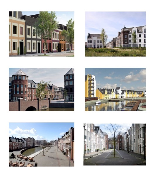 Impressie van woningen geïnspireerd door new urbanism in Nederland. Linksboven Het Centrum/De Hoven (Leidsche Rijn, Utrecht), rechtsboven De Weerd (Leidsche Rijn, Utrecht), Midden links: Citadel (Heemskerk), midden rechts Nieuw Vreeswijk (Nieuwegein), links- en rechtsonder De Veste/Brandevoort (Helmond)