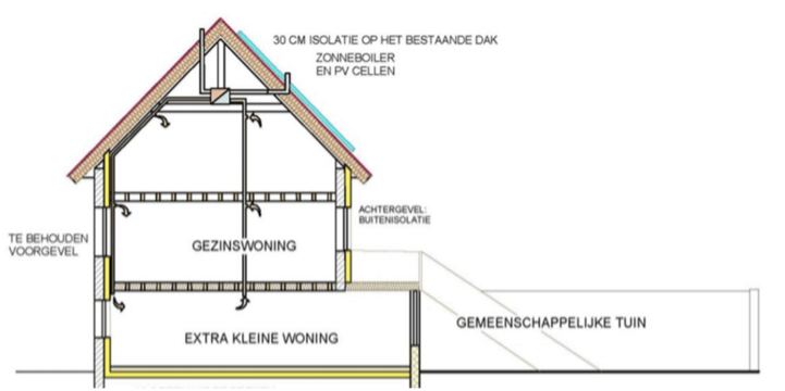 Grondgebonden woningen kunnen op verschillende manieren worden gesplitst. De benedenverdiepingen kunnen worden voorzien van een uitbouw, waarvan het dak fungeert voor de ontsluiting van de bovenwoningen en ook ruime ontmoetings- en speelruimte biedt. In zijn publicatie Verdichting in de steden heeft de architect Hugo Vanderstadt berekent dat deze vorm van renovatie ook voor België grote mogelijkheden biedt om de leefbaarheid van steden te vergroten zonder nieuwbouw (Zie de onderstaande afbeelding).