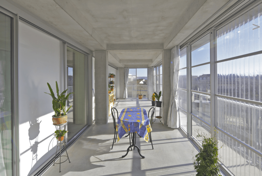 De prestigieuze jaarlijkse Pritzkerprijs gaat doorgaans naar sterarchitecten vanwege hun spraakmakende bijdrage aan de architectuur. De winnaars dit jaar, Anne Lacaton en Jean-Philippe Vassal wijken in alle opzichten af van dit beeld. Hun devies is breek nooit iets af, maar vernieuw de architectuur door hergebruik en herinrichting van bestaande gebouwen. Concrete aanleiding was de renovatie van een uitgeleefd complex van sociale woningen in Bordeaux. Zij deden dat in nauw overleg met de bewoners, die tijdens de renovatie hun huizen niet hoefden te verlaten. Het gebouw bestaat uit in omvang variërende appartementen rond afzonderlijke trappenhuizen, wat de woningen een bedompt karakter gaf. Lacaton en Vassal bouwden aan een kant brede galerijen, aan de buitenkant af te sluiten met glazen deuren. Tussen de ‘wintertuinen’ werden in overleg met de bewoners geen scheidingen aangebracht, wat sociale contacten – inclusief sociale controle – en speelmogelijkheden voor de kinderen stimuleert (zie afbeeldingen)