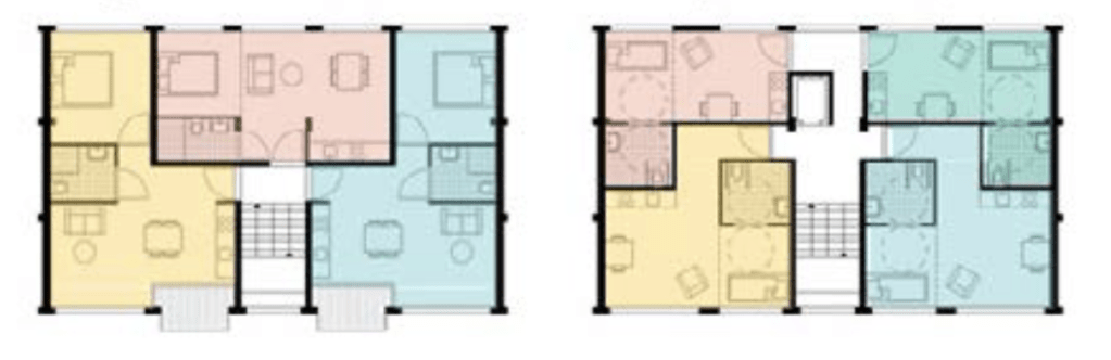 Etages in portiekflats, doorgaans bestaande uit twee wooneenheden aan weerszijden van een trapportaal, kunnen deels worden heringedeeld tot drie eenheden voor tweepersoonshuishoudens en vier eenheden voor eenpersoonshuishoudens (Afbeelding).