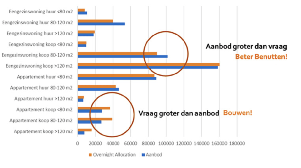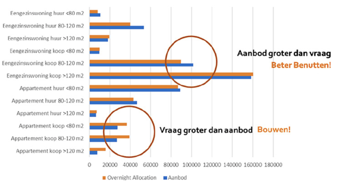 Als je eveneens uitgaande van deze norm kijkt naar het aanbod van huizen, dan zie je waar het aanbod op de woningmarkt te royaal is en waar het knelt: Er is een overschot aan middelgrote eengezinswoningen en een tekort aan appartementen in alle grootteklassen.