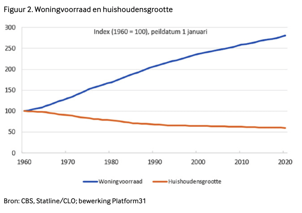 Volgens stedenbouwkundige Rudy Uytenhaak zijn Nederlanders vanaf 1900 24 maal meer ruimte gaan verwonen, terwijl het aantal huishoudens slechts is verdrievoudigd. De huizen zijn tweemaal zo groot, de kavels eveneens en het aantal bewoners per huis is meer dan gehalveerd. Vanaf 1960 is het aantal inwoners van Nederland toegenomen van 11,4 naar 17,4 miljoen en is het aantal wooneenheden gegroeid met 280% (Zie figuur). 40% van alle wooneenheden in Nederland, die vrijwel uitsluitend gebouwd zijn voor gezinnen, heeft slechts één bewoner. De komende decennia zullen er nog 800.000 huishoudens bijkomen en dat zijn grotendeels eenpersoonshuishoudens.