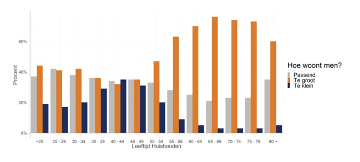 Het beeld van de mismatch tussen vraag en aanbod tekent zich nog scherper af als je de bovenstaande norm hanteert om het verschil te laten zien tussen passend, te groot en te klein wonen per leeftijdsgroep.