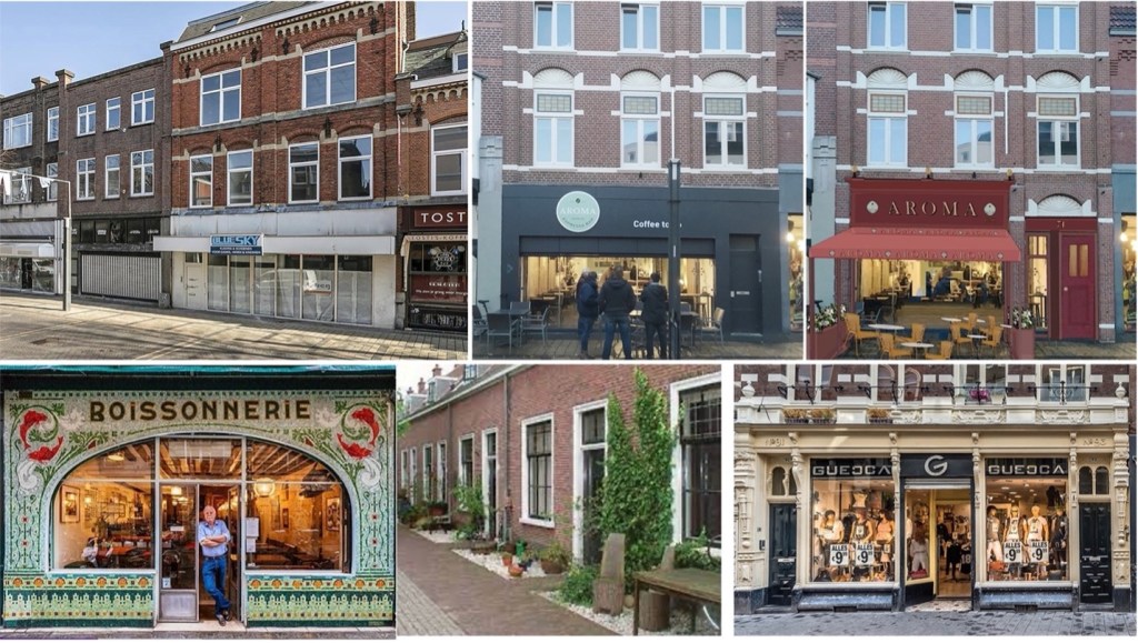 In veel vooroorlogse winkelstraten is de plint ontworpen als een integraal onderdeel van het pand. In de jaren ’60 en ’70 hebben veel winkeliers hun zaken gemoderniseerd en hele pui gesloopt. De muren van de bovenverdieping, soms van enkele panden tegelijk, kwamen te rusten op een zware stalen balk en de plint werd overwegend van glas (afbeelding links boven). Vaak ontbreekt zelf een deur naar de bovenverdiepingen, waardoor de woonfunctie daarvan onmogelijk werd gemaakt. In eerste instantie hebben deze modernistische puien de ‘uitstal’functie van de benedenverdieping vergroot. Het effect voor het straatbeeld is echter negatief gebleken. In Heerlen is kunstenaar en ‘would be’ stedenbouwkundige Michel Huisman (de men achter het Maankwartier) druk doende om samen met vrijwilligers en met steun van de gemeente oude puien te herstellen (beide afbeeldingen rechtsboven). Ook in Amsterdam vinden zulke hersteloperaties plaats (foto rechtsonder)