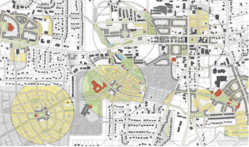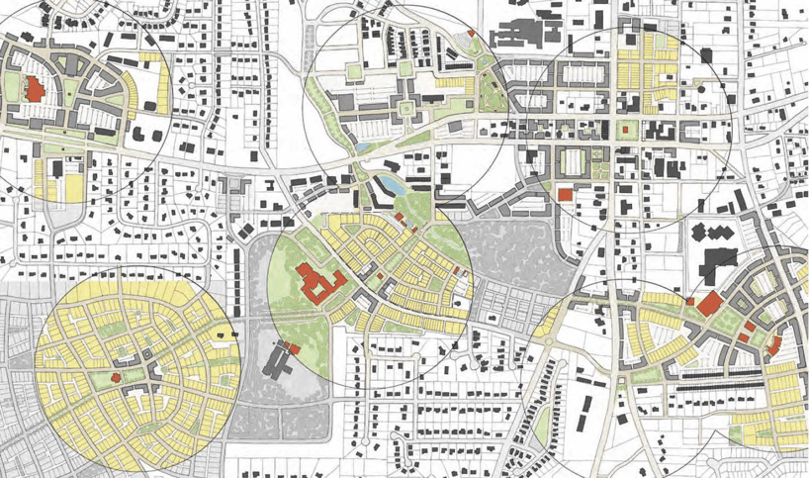 Voor de ruimte tussen de cirkels kan gedacht worden aan meer grootschalig groen, wijk-overstijgende voorzieningen, een ondergrondse parkeergarage, routes voor het openbaar vervoer en doorgaande wegen. Vaak zullen de buurten trouwens naadloos in elkaar overgaan.