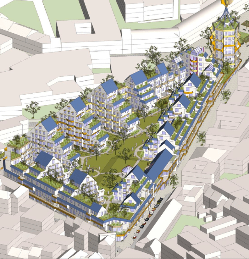 De afbeelding hierboven is een schets van het ‘Plan Papenvest’ in Brussel. De dichtheid van ongeveer 300 levensloopbestendige wooneenheden op een oppervlak van 1,13 hectare is meer dan tienmaal zo groot als die van een gemiddelde Vinexwijk. Vaak wordt erop gewezen dat de dichtheid van Nederlandse steden veel lager is dan bijvoorbeeld Parijs en Barcelona. Maar juist in deze steden geldt dat de verkeersdrukte een van de belangrijkste oorzaken is van luchtvervuiling, stress en gezondheidsklachten. De voordelen van verdichting met behoud van een hoogwaardige leefomgeving worden alleen gerealiseerd als tegelijkertijd de overlast van de verdichting wordt beperkt. Dit betekent onherroepelijk vermindering van het autogebruik om te voorkomen dat de wegen nog voller worden er nog meer auto’s op straat geparkeerd staan. In ‘plan Papenvest’ is er nauwelijks ruimte waar bewoners een auto kunnen stallen.
