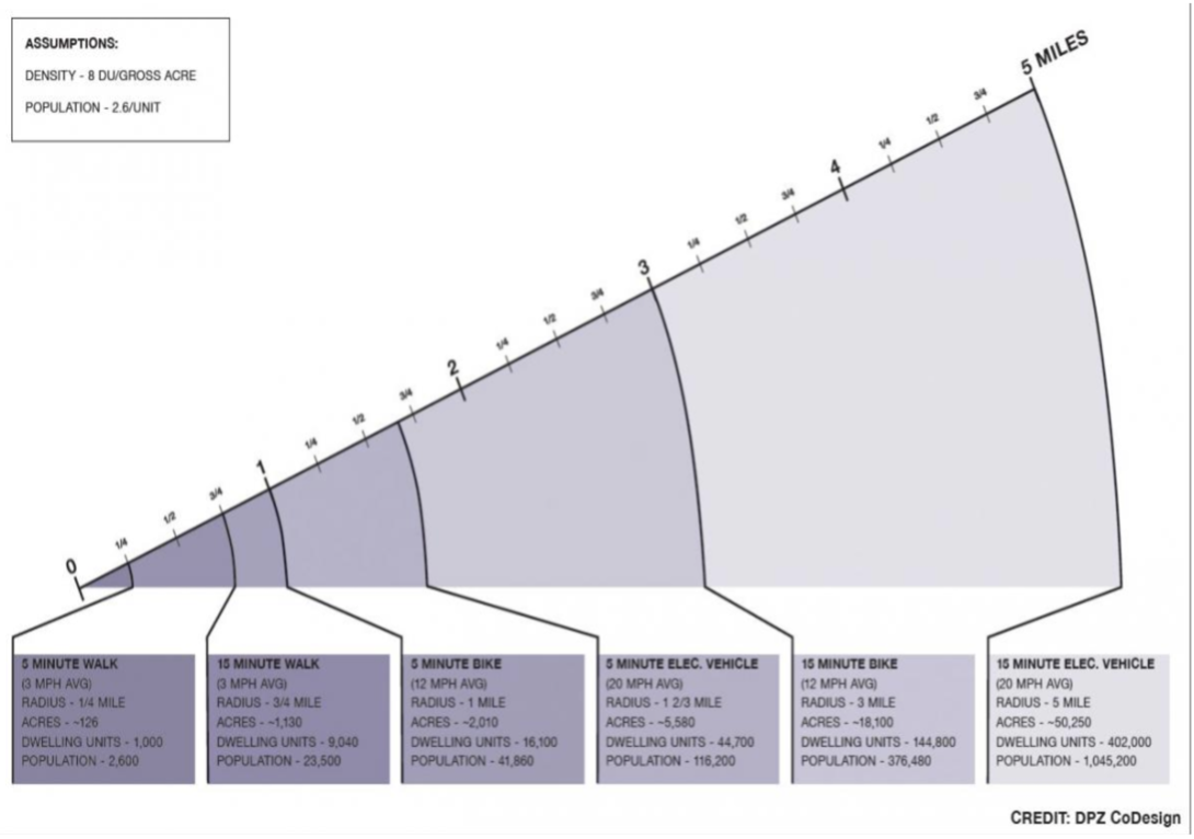 Hier is de afstand van ‘centrum’ naar rand ongeveer 1 km. In dit gebied zijn de meeste voorzieningen die bewoners nodig hebben beschikbaar, waarbij er niet per se gedacht hoeft te worden aan één centrum, maar ook aan een spreiding van voorzieningen over de centra van de 5-minuten loopzones. Dat geldt bijvoorbeeld voor een wat grotere supermarkt, die ook tussen twee 5-minuten loopzones in kan liggen. Verder zullen in deze zone een of meer grotere parken te vinden zijn en ook wat grotere concentraties van werkgelegenheid.