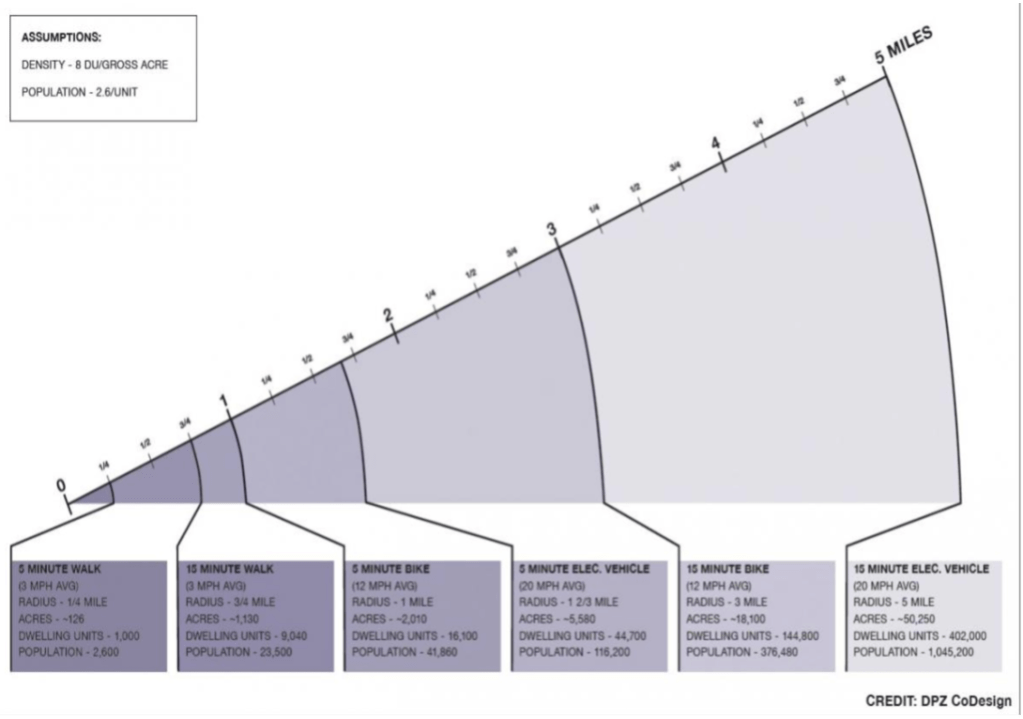 Het zijn in het bijzonder de aanhangers van ‘new urbanism’, die al vanaf de jaren ’80 het instrumentarium hebben ontwikkeld om 15-minuten steden te ontwerpen en te ontwikkelen. Ze gaan daarbij uit van drie zones: de 5-minuten loopzone, de 15-minuten loopzone, die samenvalt met de 5-minuten fietszone en als laatste de 15-minuten fietszone. Dit zijn geen statische begrippen: de zones lopen in de praktijk in elkaar over en vullen elkaar aan.