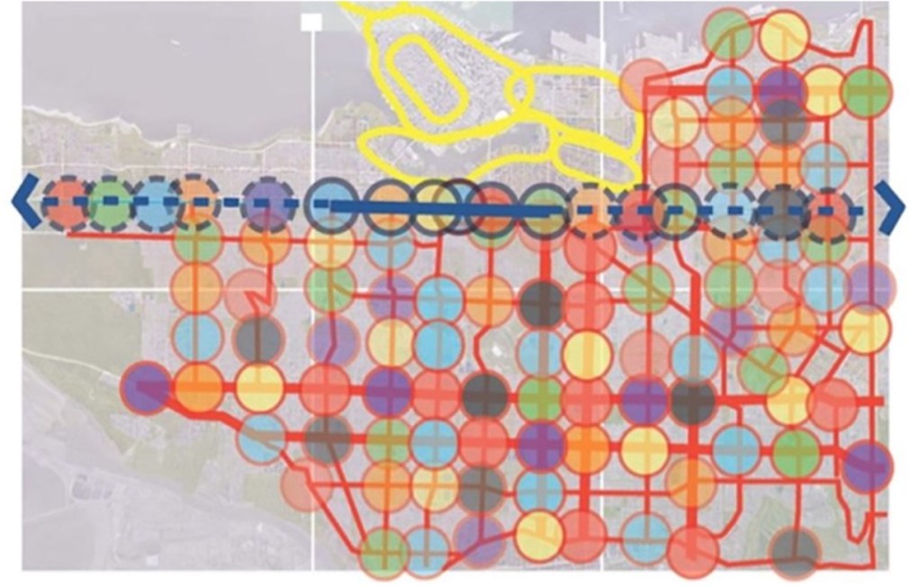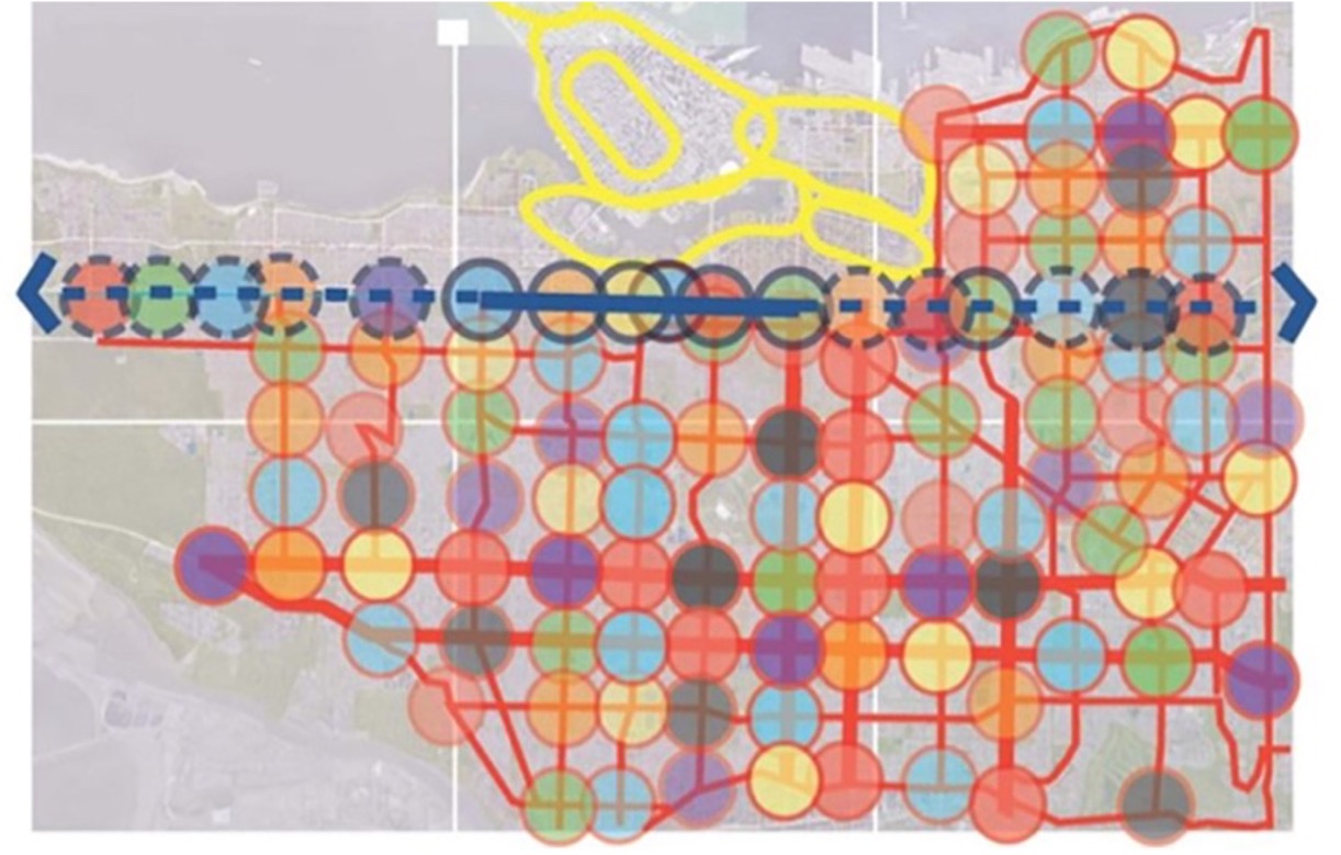 In Vancouver spreekt men over een 5-minutenstad. De bedoeling is dat buurten duidelijker van elkaar te onderscheiden delen van de stad worden. Elke buurt zou een aantal winkels van lokale eigenaren moeten hebben en daarnaast openbare voorzieningen zoals parken, scholen, gemeenschapscentra, kinderopvang en bibliotheken. Hoog op de agenda staat het streven naar een grotere verscheidenheid van inwoners en typen huizen. Vooral in buurten in de in de binnenstad gaat dit gepaard met hoge dichtheden en hoogbouw. Confrontatie van dit idee met de realiteit levert een patroon op van ongeveer 120 van dit soort geografische eenheden (zie bovenstaande kaart).